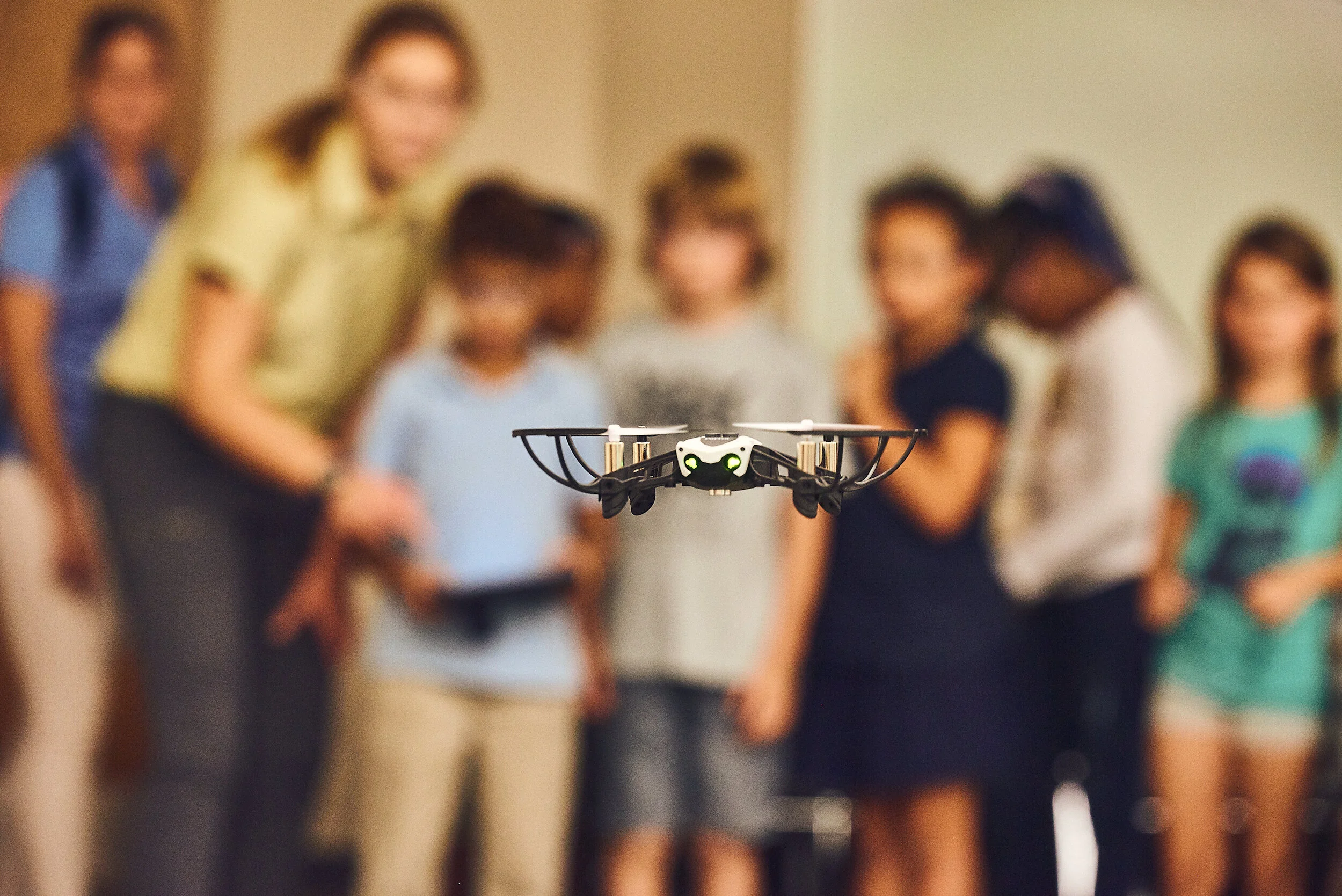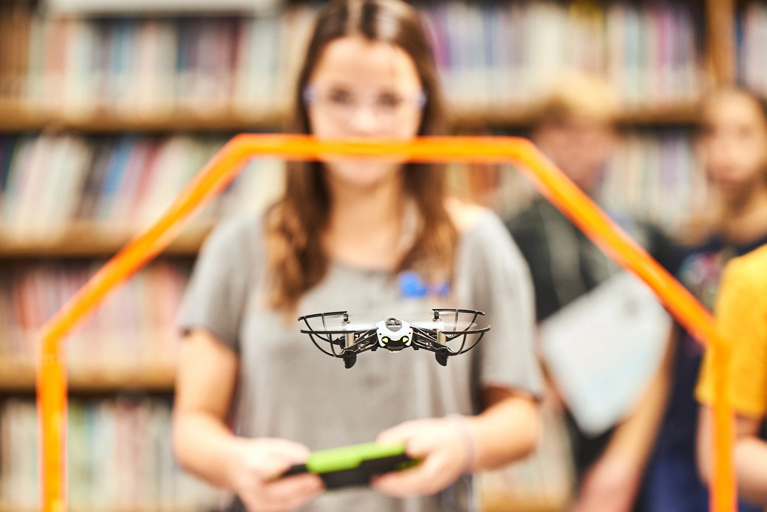 Students become mini-drone pilots and have a chance to maneuver their way through an obstacle course of buildings, trees, and over water. A countdown clock times their flight as students realize they must learn to land the drone before the battery runs out while in the field.